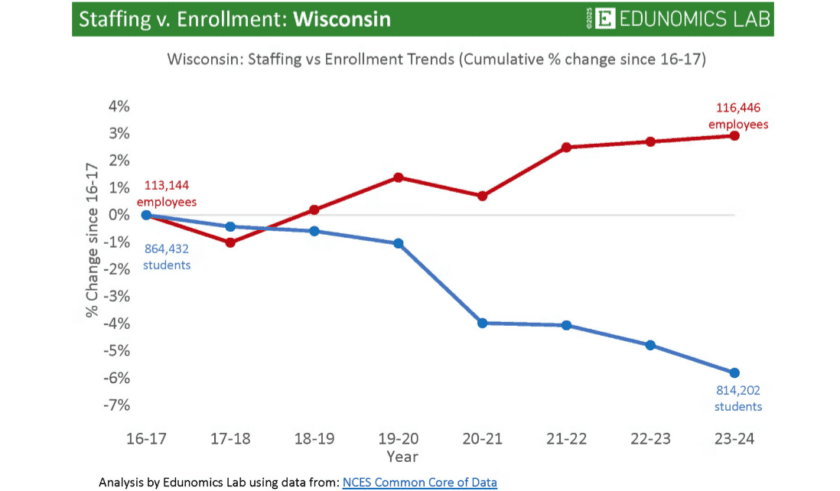 The response from Wisconsin media? Crickets. I have searched in vain for a single story explaining that public school staffing has grown for years while enrollment has declined. I would be glad to stand corrected. Instead, many readers are left to conclude — wrongly — that public schools (1) lose funds to private schools; (2) have squeezed inefficiencies from their budgets; and (3) often have no choice but to pursue voter referenda.