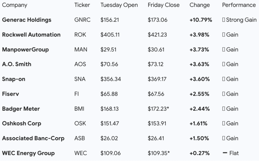 Following the market closure on Monday, January 19, for Martin Luther King Jr. Day, Wisconsin’s major public companies saw a shortened but largely positive trading week (Tuesday–Friday).